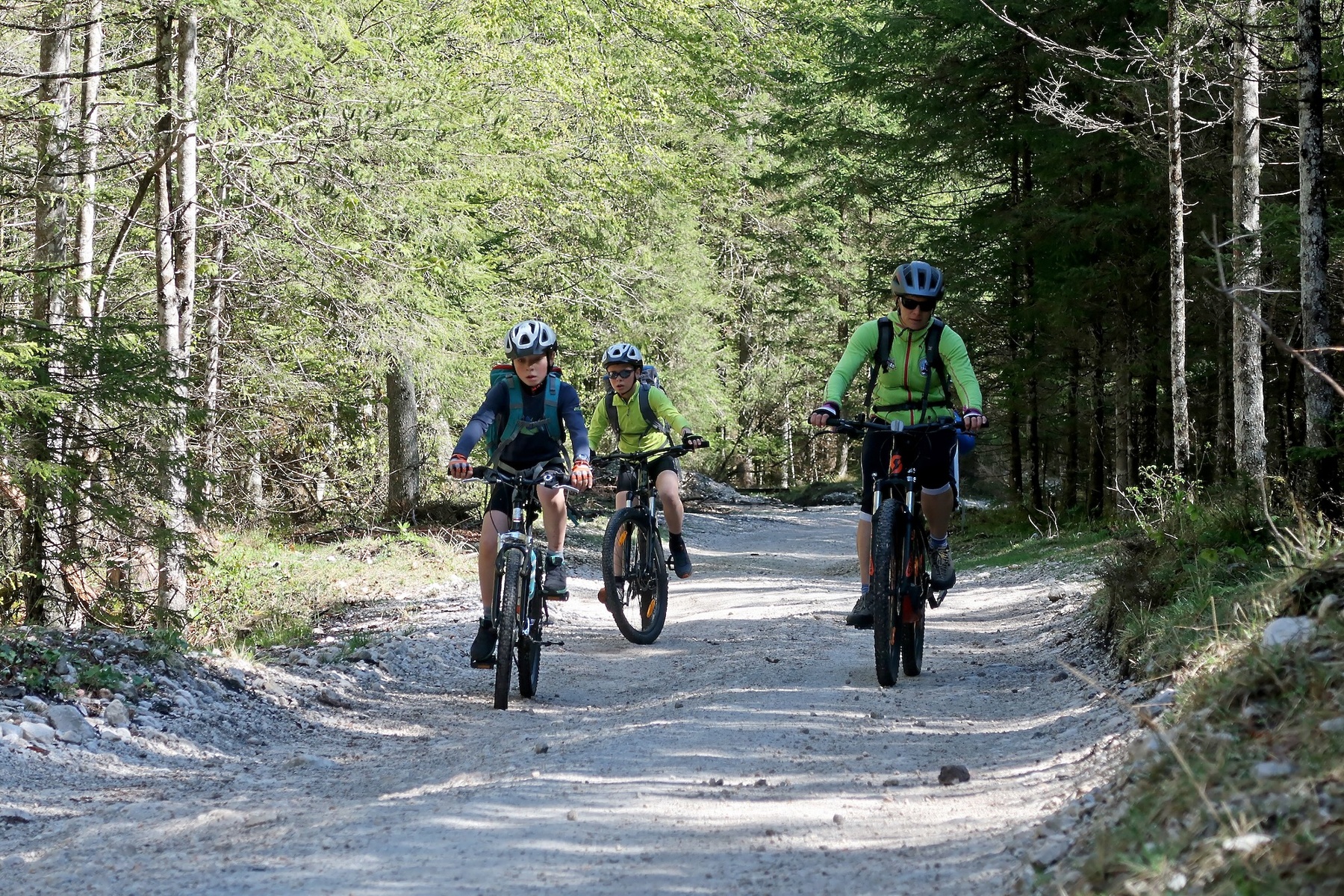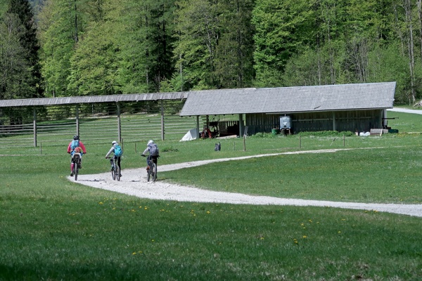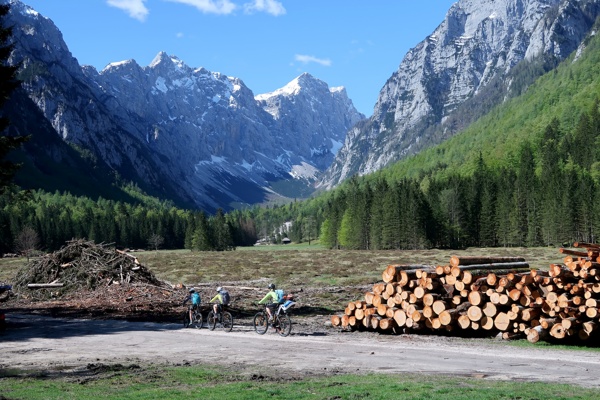 Start the trip in front of the Slovenian Alpine Museum in the direction in Vrata valley. Turn left before the ascent, crossing the green bridge over the Triglavska Bistrica river. Continue up the hill through the plain in Mlačca, past the tennis courts, and ascend to the intersection with the main road. Follow the main road to Kosmačev Preval, the highest point of your trip. From here, descend and turn right towards Krma Valley but be careful as it is very steep.